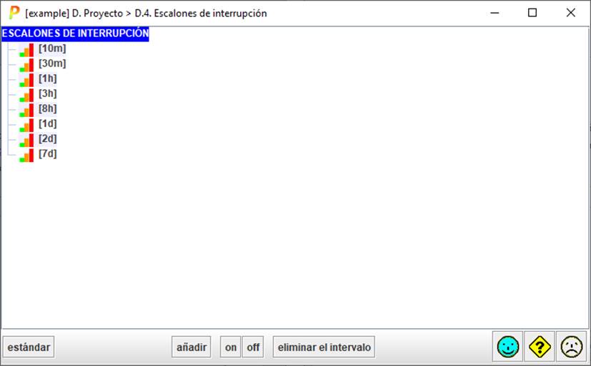 Puede usted mantener el intervalo; pero evitar que PILAR lo presente. ON – sí se presenta OFF – no se presenta (solo aparece en esta ventana) |