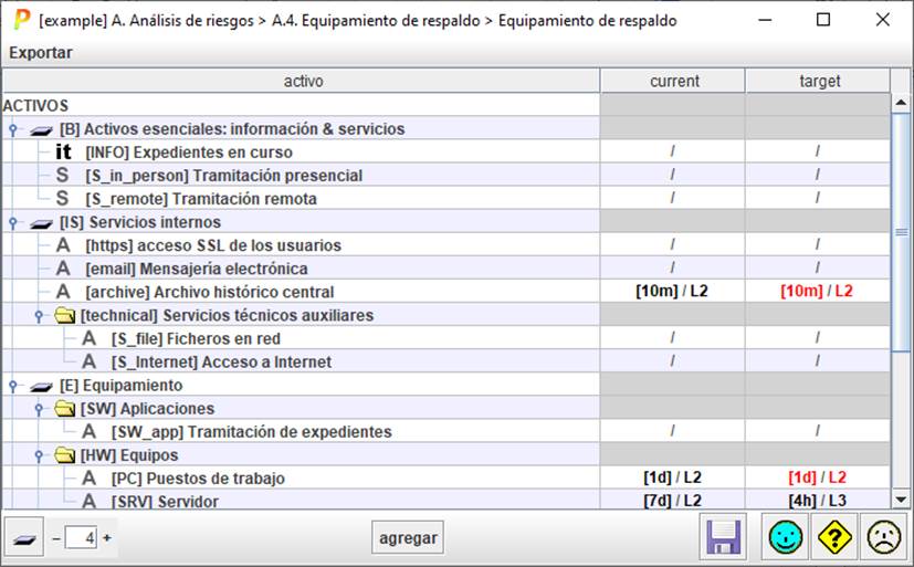 PILAR presenta las consecuencias sobre los activos esenciales de los tiempos de recuperación de los activos de los que depende. Ver “Backup / agregado |