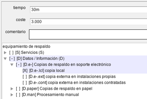 Si está trabajando en modo cuantitativo, puede añadir información de cuánto cuesta aplicar el procedimiento de reposición del activo (coste económico del mecanismo de recuperación). Por ejemplo: