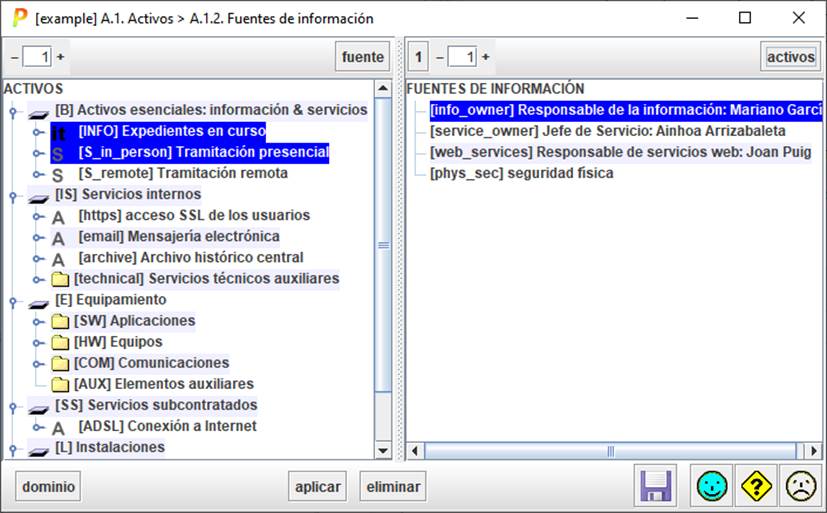 El panel izquierdo presenta el árbol de activos. El panel derecho, las fuentes de información.