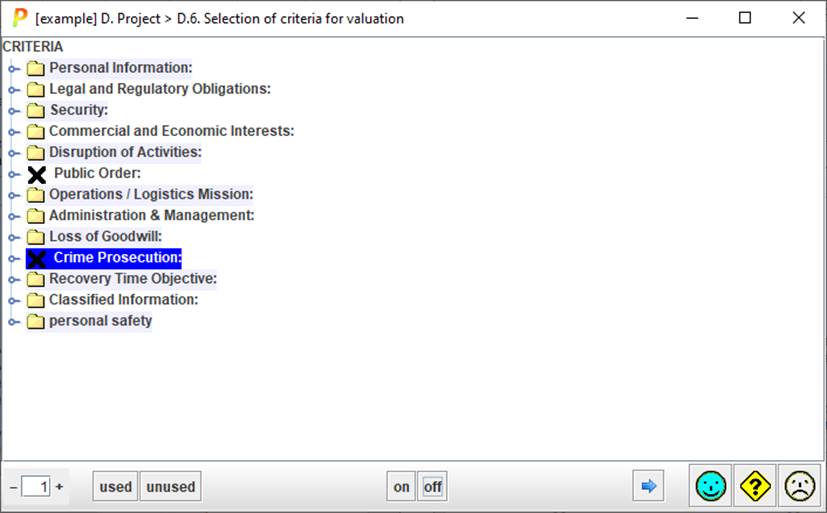 Basic use: select one or more criteria on central panel and click bottom ON / OFF buttons to select / unselect the criteria.