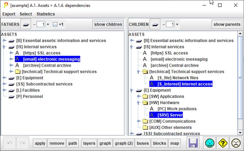 Select an asset on the right panel. Click SHOW PARENTS for PILAR to select the direct ascendants, and mark the indirect ascendants, on the left tree. |