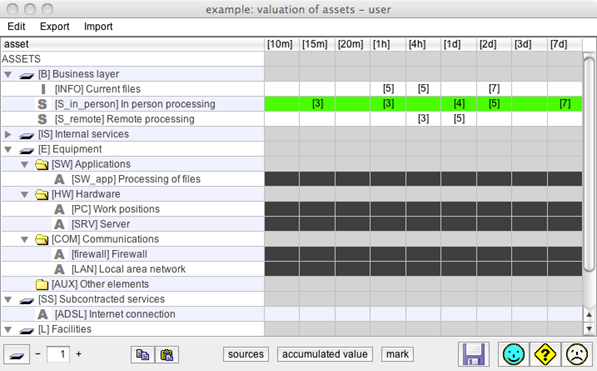 Useful to see how value is propagated. Select one cell in [6] or [7], click MARK. The value source is on green background. The destination of the value is on black background. For instance, to see how the needs on accountability are translated into integrity and authenticity of activity registers: