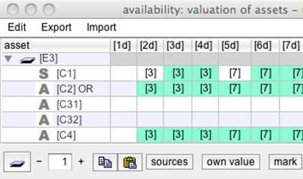 If the asset is marked as "[availability.easy]" (see asset classes), then the availability value is reduced by an order of magnitude (3 levels in the level rating scale). This adjustment will be reflected in the assessment of the impact of threats. The local value is reduced without affecting the value that is further propagated down the dependencies.