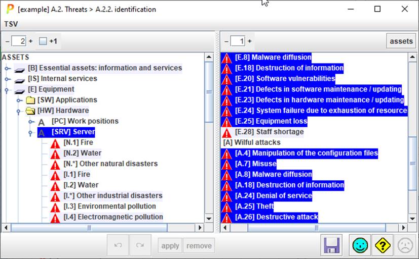 — Select one or more assets in the left panel ([8]). — Select one or more threats in the right panel ([9]). — Click APPLY t PILAR associates the selected threats to the selected assets. |