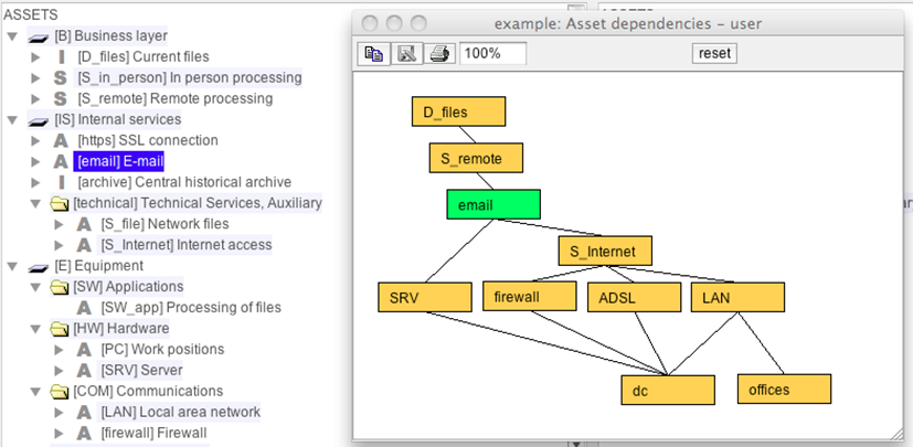 The graph shows the relationships between assets. It only presents the assets related to those selected on the main screen, or all the assets if nothing is selected.