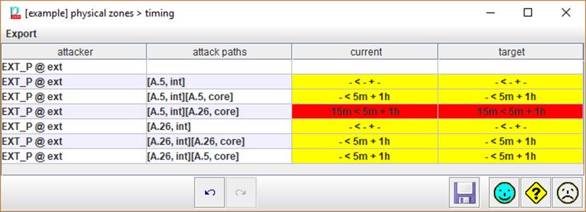 Let’s see an example. There are 3 zones: external, intermediate, and internal. There is an external attacker that tries to get inside. The attacker requires 10 minutes. The border systems take 5 min to detect, and reaction requires 1 hour.