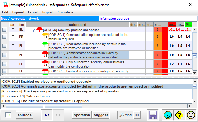 Select a project phase: click on the header column, which shall become RED. Click on SUGGEST. PILAR splits the window so that in the bottom pane there is a list of safeguards, sorted by interest. Interest is a ranking assigned by PILAR based on the safeguard recommendation and current maturity. Click on the safeguard to locate it on the top panel.