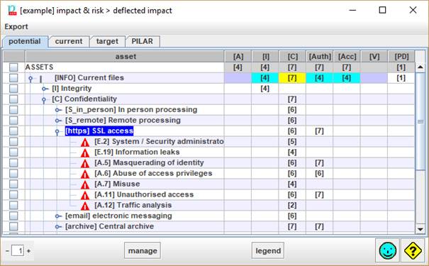 Assets tree. 1st level: assets with a value: deflected impact. 2nd level: split down of security dimensions: deflected impact. 3rd level: assets below (in dependency tree): accumulated impact. 4th level: threats impacting the assets: accumulated impact. |