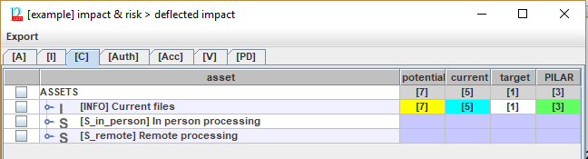 When you click on the header of a security dimension column, PILAR switches between columns and tabs, and presents the following image: