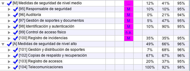 Algunos perfiles de seguridad imponen la obligación de cumplir ciertos controles. Es una cuestión de cumplimiento. A veces es incondicional; otras veces puede que dependa de ciertas circunstancias (como puede ser el nivel de clasificación de la información que se maneja, por ejemplo). Cuando se conocen estos requisitos, PILAR colorea la celda de aplicabilidad (incluso si la celda no es aplicable por alguna circunstancia).