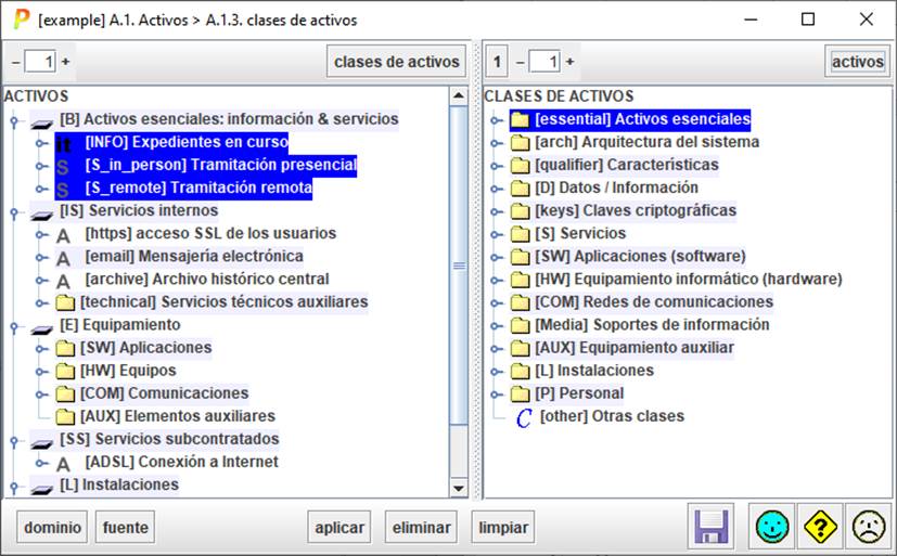 — Seleccione una o más fuentes a la derecha — Haga clic en ACTIVOS. PILAR seleccionará los activos asociados a la izquierda |