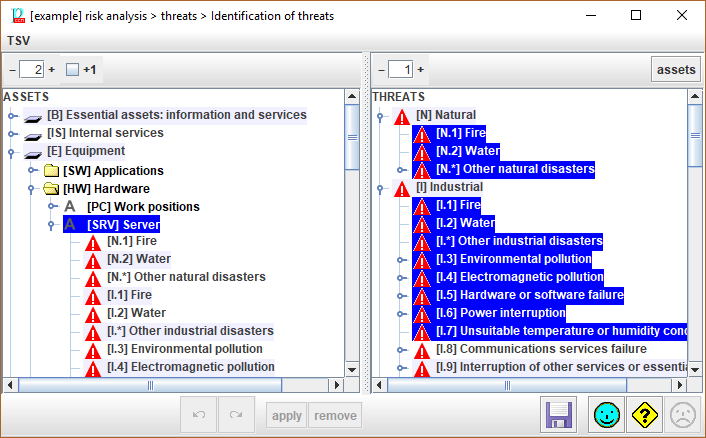 PILAR selects on the left panel, the assets that are associated to the selected threats. |