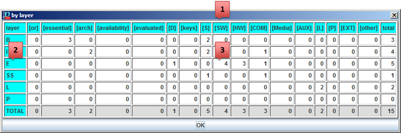 Each row refers to a layer (or domain, or source). For instance, [2] marks [E]. In row [2], 1 asset has a mark in class [availability], 2 assets in [D], 3 assets in [D], and so on.