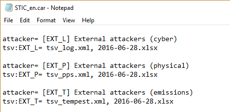 For a logical attacker like EXT_L, his capabilities on border system are described in tsv_log.xml. Once the border is passed, its capabilities are described by means of 2016-06-28.xlsx.