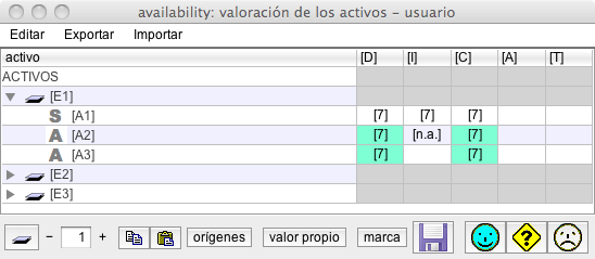 Los activos acumulan la valoración de sus superiores (por dependencias). Si nos interesa anular la valoración en un cierto activo, e impedir que se siga propagando a los activos inferiores (por dependencias), en la pantalla de determinación del nivel de valoración, seleccione N.A.