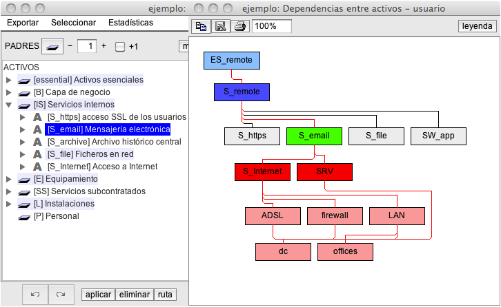Los activos se posicionan en la pantalla de forma heurística de tal forma que todas las relaciones de dependencia van hacia ‘abajo’. PILAR crea unos buses o pistas de conexión entre activos, evitando que los enlaces pasen por encima de los activos.
