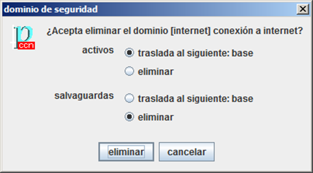 Cuando vaya a eliminar un dominio, PILAR le preguntará qué desea hacer con los datos asociados a ese dominio. Concretamente, el usuario debe indicar qué hacer con los activos en ese dominio y qué hacer con las salvaguardas evaluadas en ese dominio. Si el dominio no es subdominio de otro, hay poco que hacer: eliminar los datos. Pero si el dominio está anidado, es posible pasar la información al dominio que lo envuelve:
