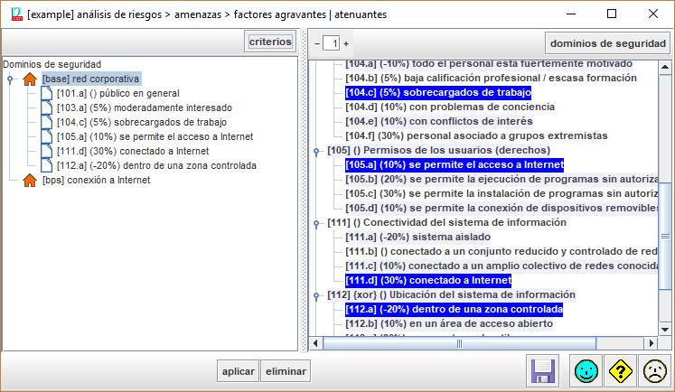 Seleccione un dominio de seguridad a la izquierda. Haga clic en CRITERIOS. PILAR presenta a la derecha los criterios que se aplican en el dominio seleccionado. |