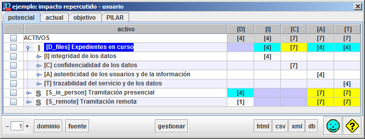Para las filas seleccionadas en la columna 1, PILAR recolecta los riesgos asociados y salta a la ventana de [[valoración de salvaguardas]], teniendo en cuenta solo dichos riesgos. |