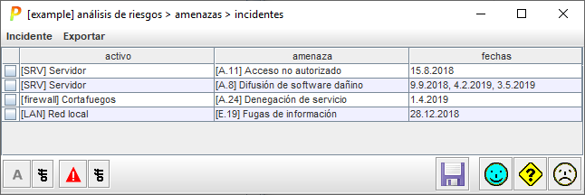 Si hace clic en las cabeceras de las columnas, PILAR ordena los incidentes por activo, amenaza o última incidencia observada.