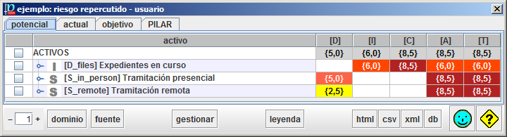 Para las filas seleccionadas en la columna 1, PILAR recolecta los riesgos asociados y salta a la ventana de [[valoración de salvaguardas]], teniendo en cuenta solo dichos riesgos. |