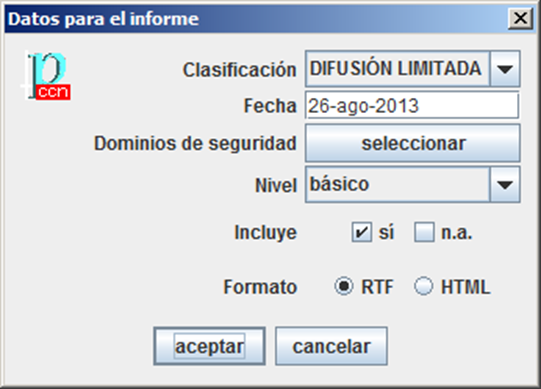 Fija la marca de clasificación del informe. Se marca un mínimo en [[marcas de seguridad]]. Aquí se puede poner una marca más restrictiva. |
