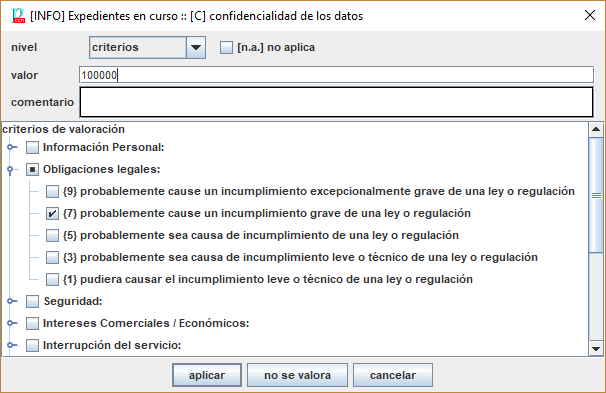 Marca el valor cualitativo. Si selecciona “CRITERIOS”, el valor lo decide la marca de mayor valor de los criterios marcados. Si selecciona un nivel, este será el asignado al activo, independientemente de los criterios marcados. |