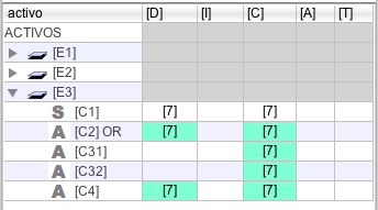 El siguiente ejemplo muestra cómo los equipos redundantes C31 y C32 no se valoran en disponibilidad, mientras que el activo común, C4, recupera el valor. Nótese que otras dimensiones no se ven afectadas por la calificación como OR.