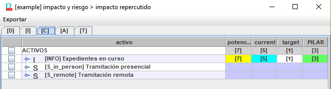 Análisis de riesgosImpacto y RiesgoImpacto repercutido Vista alternativa Impacto repercutido Si hace clic en la cabecera de una columna, PILAR conmuta entre columnas y pestaƱas: